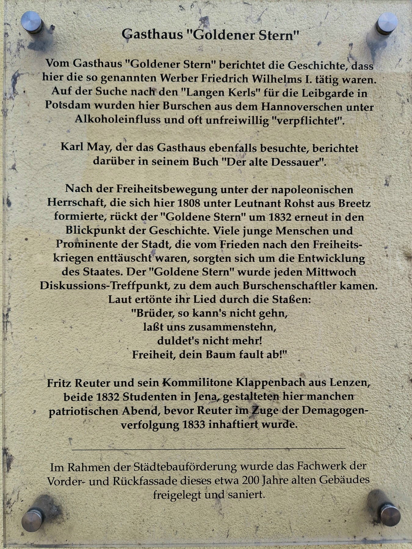 Die Gasthöfe "Zum Mecklenburger" und "Blauer Stern" sind fiktiv; allerdings gibt es einen "Gasthof zum Goldenen Stern", der sogar eine Erinnerungstafel an das Werber-Treiben hat.