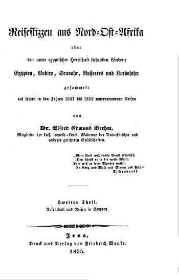 Aber Brehm bereitete die Reise nach Ägypten nicht nur belletristisch, sondern auch wissenschaftlich auf. So erschien 1855 im Verlag Friedrich Mauke in Jena unter seinem Namen ein dreibändiges Werk mit dem Titel "Reiseskizzen aus Nord-Ost-Afrika oder den unter egyptischer Herrschaft stehenden Ländern Egypten, Nubien, Sennahr, Rosseeres und Kordofahn: gesammelt auf seinen in den Jahren 1847 bis 1852 unter­nommenen Reisen".[2] Dass auch Details aus diesem Reisebericht intensiv von Karl May weiter­verarbeitet wurden, ist ebenfalls nachgewiesen. Wolfgang Hammer untersuchte beispiels­weise bereits 1996 Karl Mays Novelle ›Leilet‹ als Beispiel für seine Quellenverwendung.[3]