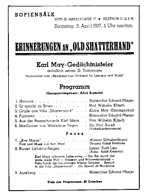 Erinnerungen an "Old Shatterhand" war der Titel einer Gedenkveranstaltung, die am 3. April 1937 in den Sofiensälen in Wien anlässlich des 25. Todestages Karl Mays gehalten wurde. Die Veranstaltung war restlos ausverkauft. ("Viele Hunderte aber mußten ohne Karten abziehen..." schrieb das Salzburger Volksblatt.)