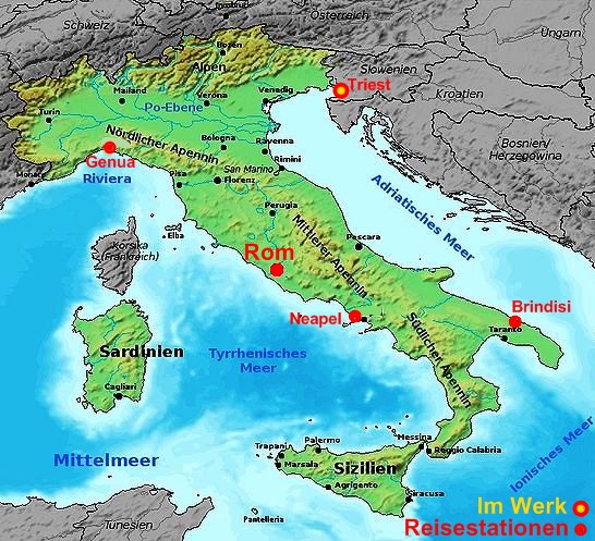 Die große Orientreise Karl Mays begann mit der Einschiffung in Genua am 4. April 1899 auf den Dampfer "Preussen" des Norddeutschen Lloyd. Am 5. April wurde kurz in Rom angelegt, dann ging die Fahrt weiter nach Ägypten. Bei seiner ersten Rückkehr aus dem Orient traf er zum Jahreswechsel 1899/1900 seine erste Gattin Emma und das Ehepaar Richard und Klara Plöhn in Arenzano bei Genua. Gemeinsam fuhren sie am 15. März 1900 nach Pisa, am 19. März nach Rom und trafen am 29. März in Neapel ein, wo sie am 4. April mit dem Reichspostdampfer "Hamburg" wieder nach Port Said reisten. Über Palästina, Istanbul und Griechenland erreichten sie Brindisi am 19., Bologna am 20. und Venedig am 21. Juli. Am 25. Juli fuhren sie mit der Eisenbahn über Bozen (drei Tage Aufenthalt) nach München.